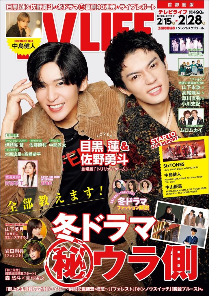 目黒蓮(Snow Man)×佐野勇斗(M!LK) 表紙 2/12発売「TV LIFE (テレビライフ) 2/28号」 目黒蓮 X LINE コピー 2025.01.162025.02.06 《表紙》 目黒蓮(Snow Man)×佐野勇斗(M!LK) 劇場版『トリリオンゲーム』 引用元:Amazon 予約受付中 楽天・Amazon・HMV・au Payマーケット・タワレコ・セブンネット・Yahooショッピング