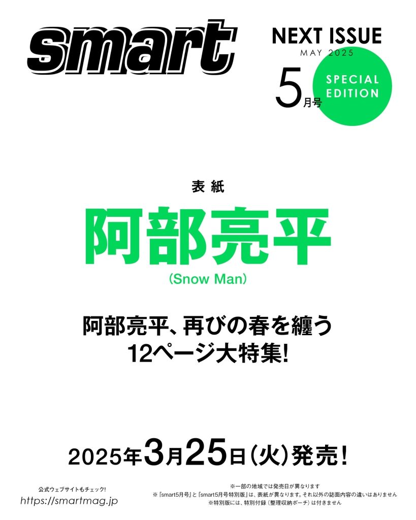 Snow Man 阿部亮平 表紙 3/25発売「smart(スマート) 5月号増刊」 阿部亮平 X LINE コピー 2025.02.272025.03.18 《表紙》阿部亮平(Snow Man)「阿部亮平、再びの春を纏う 12ページ大特集!」 引用元:Amazon 予約受付中 楽天・Amazon・HMV・au Payマーケット・タワレコ・セブンネット・Yahooショッピング