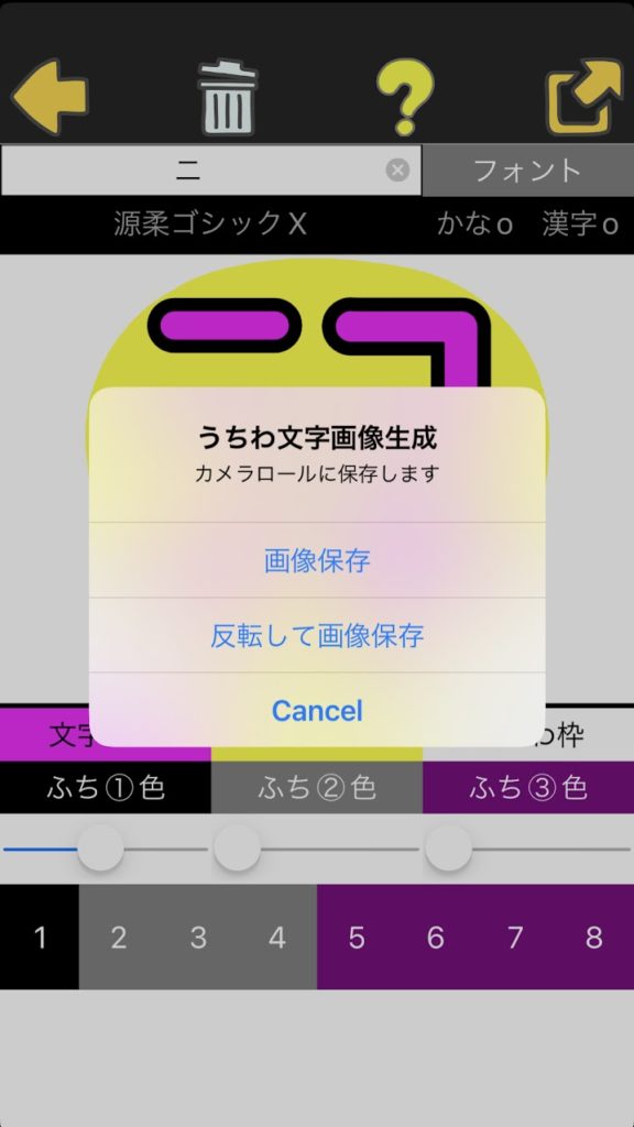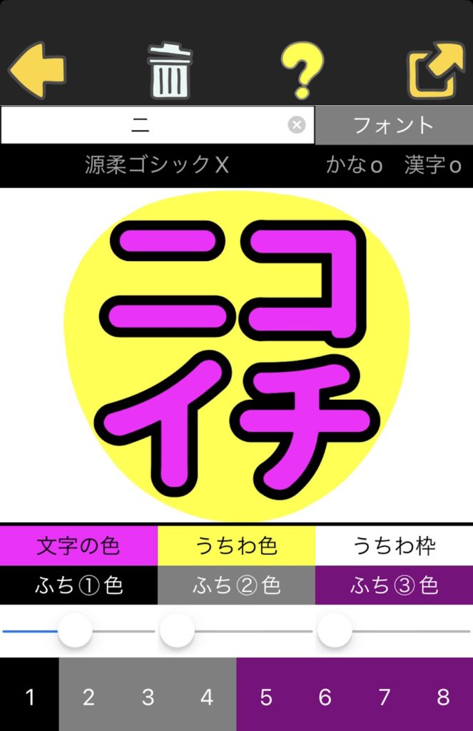 文字の色、うちわ色などは全てタップしていくと色が変わっていきます。