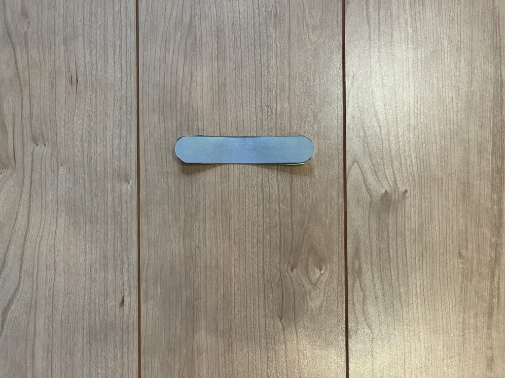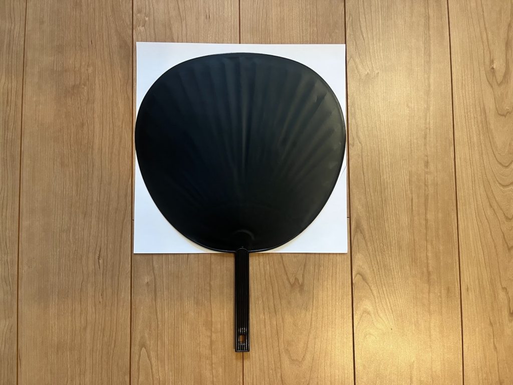 うちわにカッティングシートを貼り付けて、はみ出した部分ははさみで切ります。
