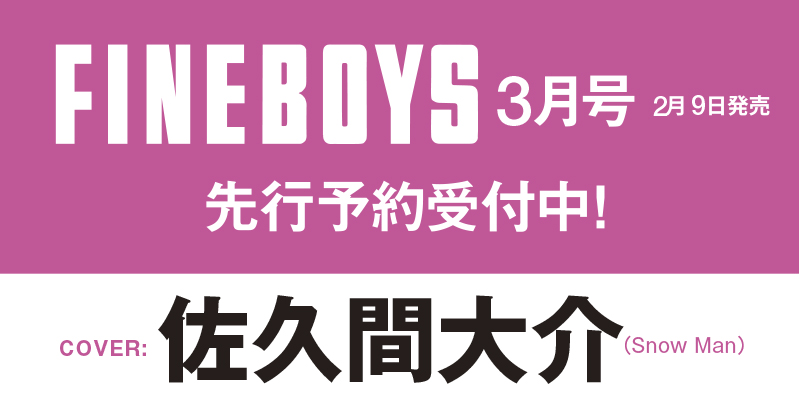 佐久間大介 表紙 2/9発売「FINEBOYS 3月号」 佐久間大介 X LINE コピー 2026.01.19 【表紙】佐久間大介(SnowMan) 予約受付中 楽天・Amazon・HMV・タワレコ・セブンネット・Yahoo!ショッピング