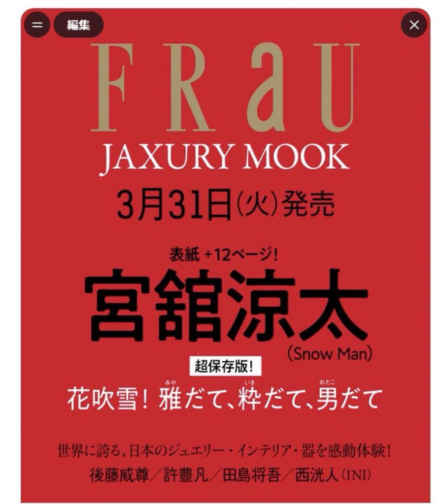 宮舘涼太 表紙 3月31日「FRaU MOOK JAXURY 2026」 宮舘涼太 X LINE コピー 2026.02.14 ■表紙+12P特集:宮舘涼太(Snow Man)『花吹雪!雅だて、粋だて、男だて』ドラマ『ターミネーターと恋しちゃったら』 予約サイト 楽天・Amazon・タワレコ・セブンネット
