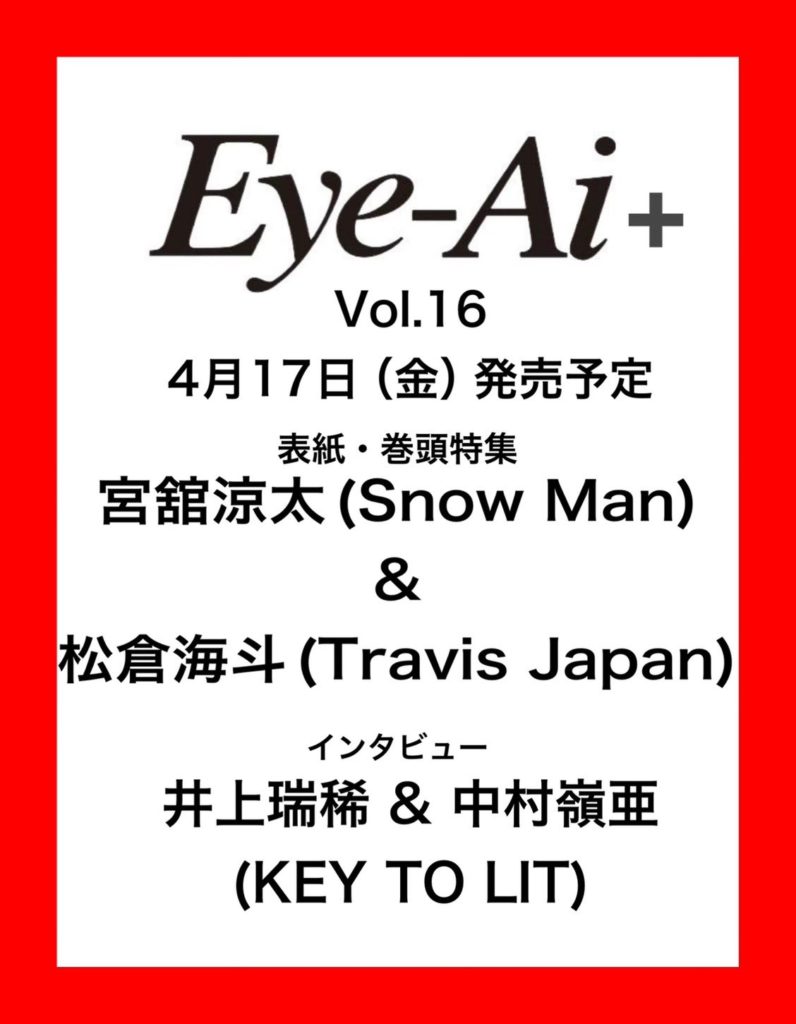 宮舘涼太&松倉海斗 表紙 4/17発売「Eye-Ai+ Vol.16」 宮舘涼太 X LINE コピー 2026.03.17 ◆表紙&巻頭特集:宮舘涼太&松倉海斗『ターミネーターと恋しちゃったら』 予約サイト 楽天・Amazon・HMV・タワレコ・セブンネット・Yahoo!ショッピング