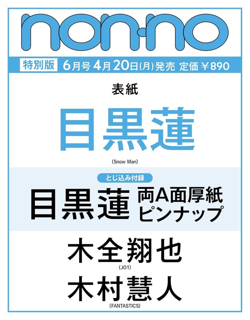 目黒蓮 表紙 4/20発売「non-no 6月号 特別版」 目黒蓮 X LINE コピー 2026.03.19 ◆表紙+8P:目黒蓮(Snow Man)『目黒蓮のONとOFF』※とじ込み付録 厚紙ピンナップ付き 予約サイト 楽天・Amazon・HMV・タワレコ・セブンネット・Yahoo!ショッピング
