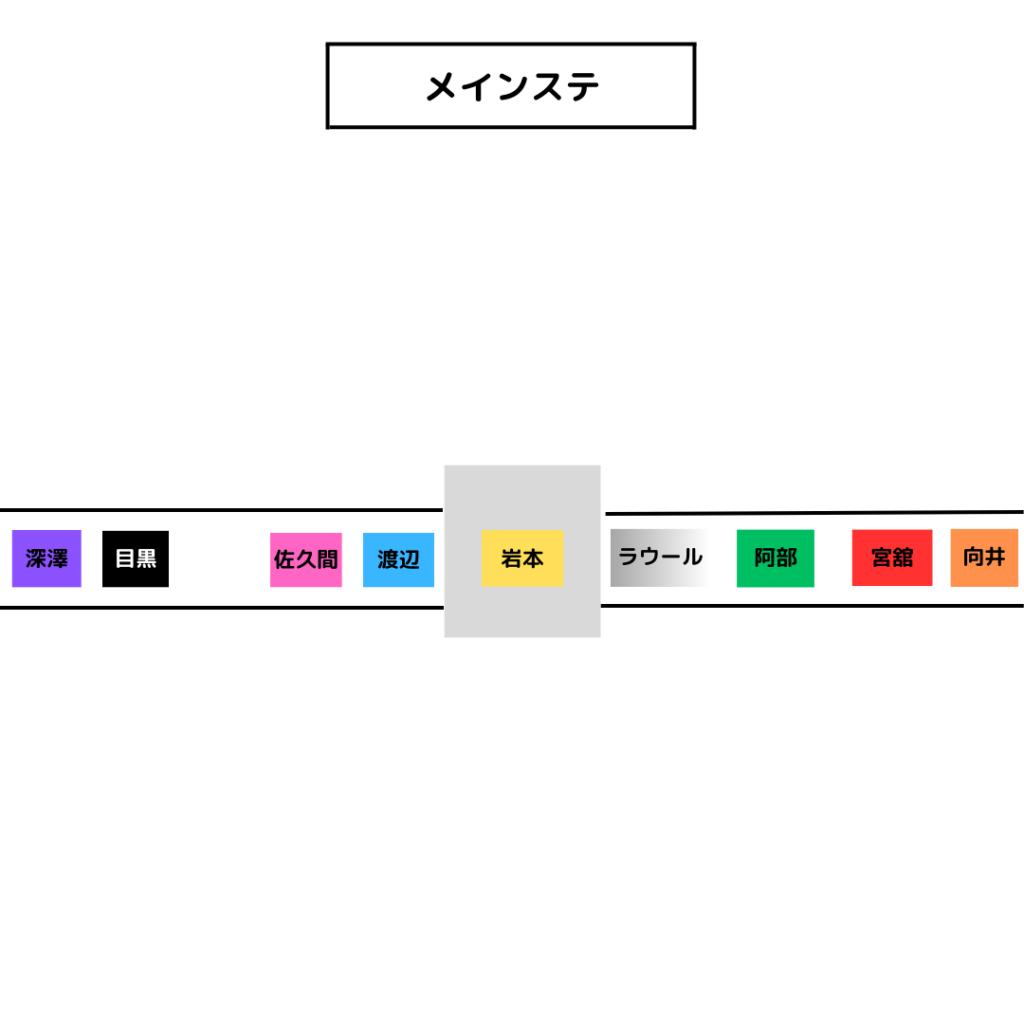 バクステから上手と下手に分かれて外周へ、そのままメインステに移動という流れです。