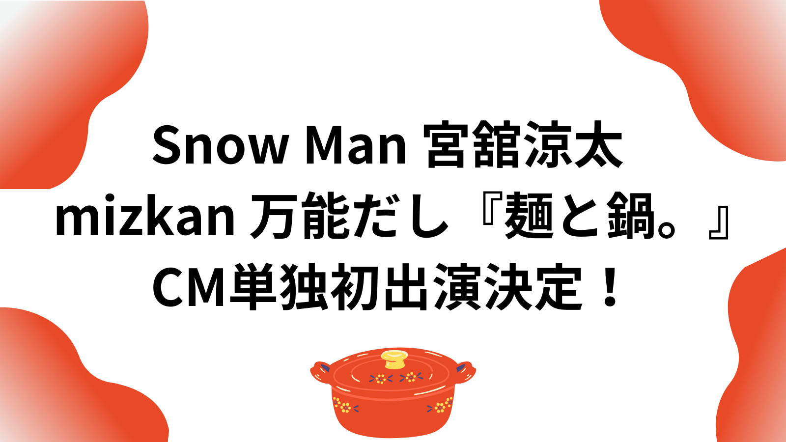 メディア情報Snow Manの宮舘涼太が、28日から公開される万能だし『麺と鍋。』の新ウェブCM「クリーミーとんこつかけそうめん」篇、「豚バラもやし炒め」篇、「大好きだしチャーハン」篇でCM単独初出演する事が発表されました。