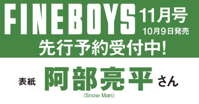SnowMan 阿部亮平 表紙 10/9発売「FINEBOYS (ファインボーイズ) 11月号」 阿部亮平 X LINE コピー 2024.09.19 《表紙》阿部亮平(Snow Man)《レギュラーモデル》目黒蓮 引用元:日之出出版公式X 予約受付中 楽天・Amazon・HMV・au Payマーケット・dショッピング・タワレコ・セブンネット・Yahooショッピング